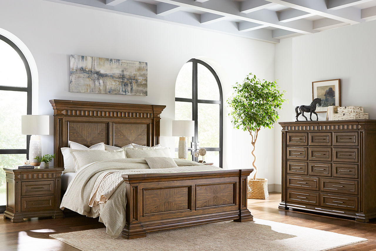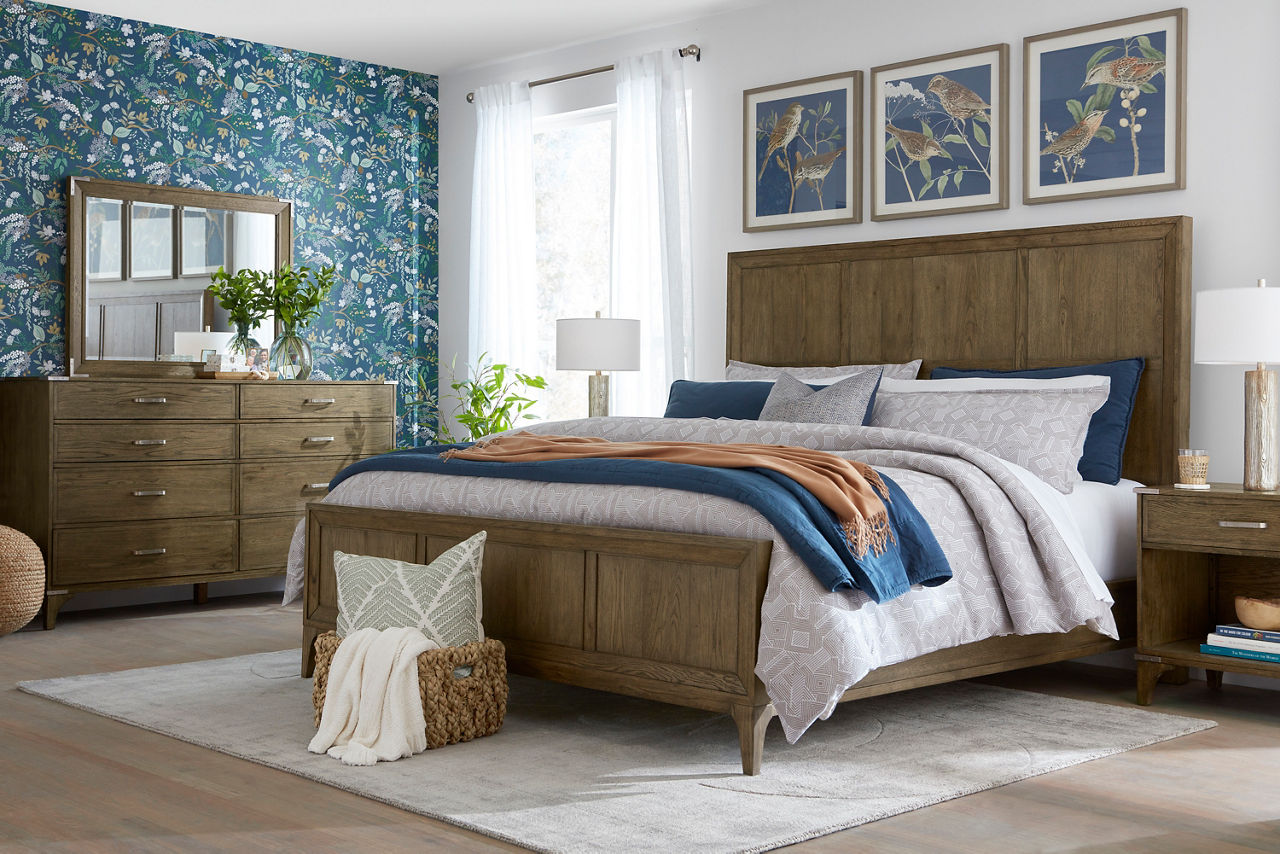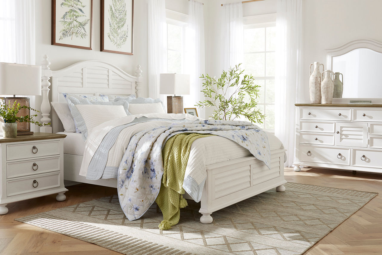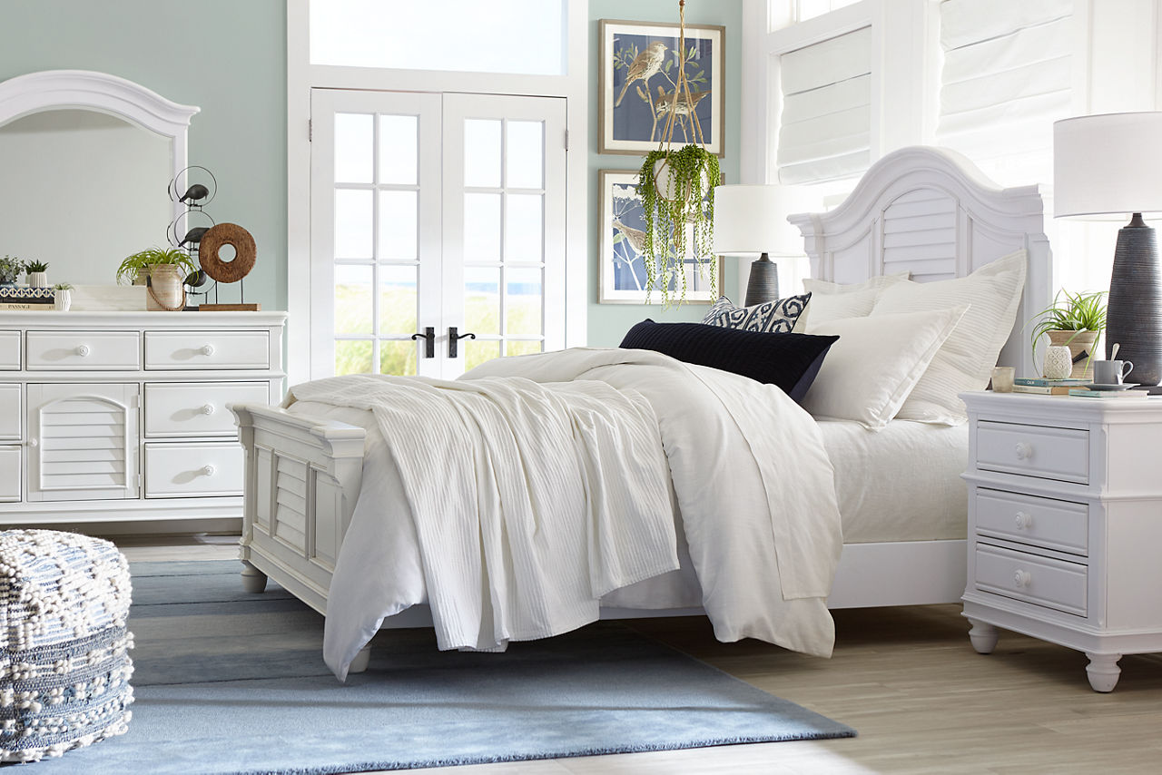 Did you know the look of your bedroom helps with better sleep and relaxation? When you're in a space that's pleasing to the eye, you'll feel more comfortable and able to unwind. Havertys bedroom collections are made for style and comfort with several bedroom design ideas to choose from. Looking for a coastal bedroom furniture set? Our Coastal Retreat couldn't be more perfect. The crisp white louvered accents fit any coastal interior design style. Matching turned-wood knobs and bun feet elevate the charm factor. The collection includes a regular or storage bed, dresser with mirror, two-drawer and open nightstands, and door chest. Can't get enough of rustic style? We have your perfect rustic bedroom furniture with our Sherman collection. The natural look of acacia solid wood and veneers with clever distressing will give you that rugged charm you want to cozy up in. This collection includes a panel bed, dresser with mirror, 3-drawer and open nightstand, chest and media chest. We know farmhouse style is a timeless design that's here to stay. That's why we offer the inviting Briar Lake collection with a choice of shiplap or barndoor bed frames. Antique white finishes are complemented by black metal hardware in this collection that includes adult and kids’ beds, adult and kids’ dresser with mirror 2-drawer nightstand and open nightstand, chest and door chest. Experience the formal elegance of our Bernhard collection with burnished bark finish, ornate lattice design and vintage hardware. You'll feel likeroyalty every time you drift into dreamland with this bedroom furniture set that includes a bed, dresser with mirror, 3-drawer nightstand, chest and master chest. Once you've selected your dream bedroom set, be sure to read how to care for the material in our Furniture Care Guide. You can start your search for your personalized bedroom collection by using our online room planning tool and 3D Room Planner. Our sales consultants and Havertys Design Experts can help you select the best bed, nightstand, dresser and accent chair to go with your bedroom set. Update a few pieces, mix and match or purchase a complete bedroom furniture collection ready for our expert delivery. Our Top Drawer Delivery service will uncrate, inspect and protect your pieces before they enter the delivery truck and assemble your items in your home.