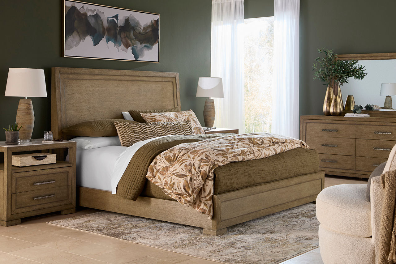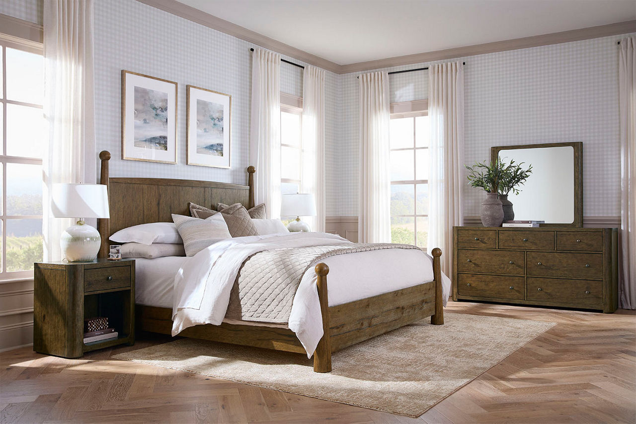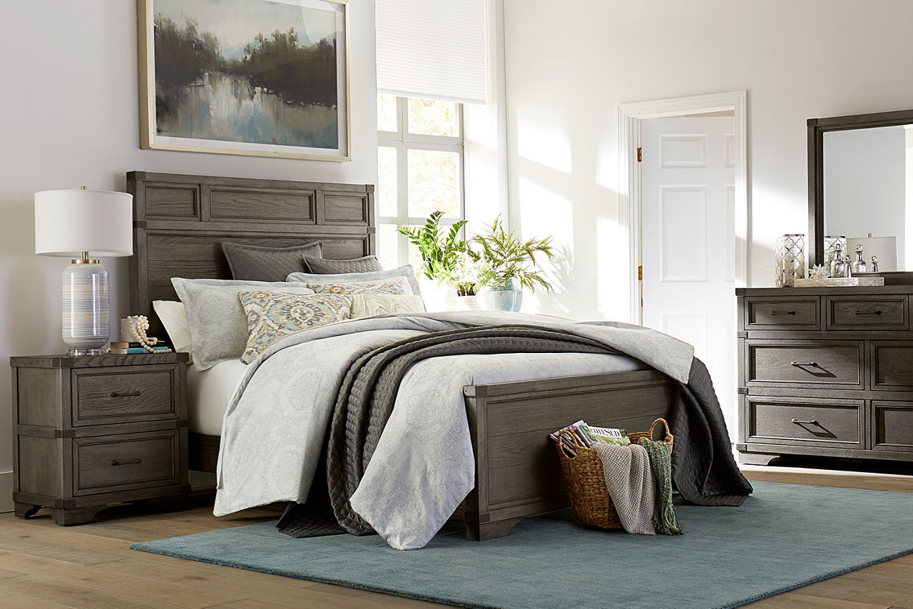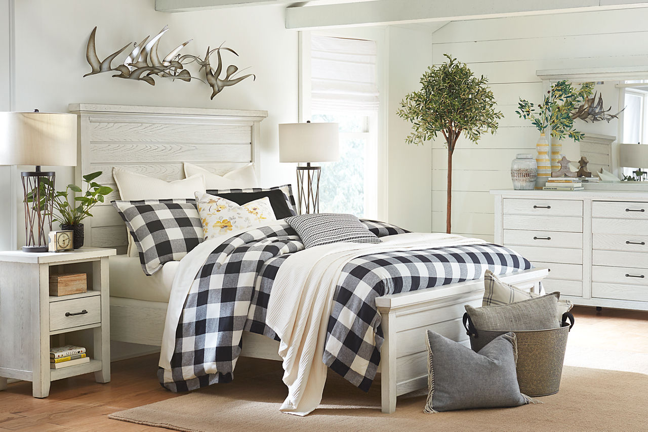 Did you know the look of your bedroom helps with better sleep and relaxation? When you're in a space that's pleasing to the eye, you'll feel more comfortable and able to unwind. Havertys bedroom collections are made for style and comfort with several bedroom design ideas to choose from. Looking for a coastal bedroom furniture set? Our Coastal Retreat couldn't be more perfect. The crisp white louvered accents fit any coastal interior design style. Matching turned-wood knobs and bun feet elevate the charm factor. The collection includes a regular or storage bed, dresser with mirror, two-drawer and open nightstands, and door chest. Can't get enough of rustic style? We have your perfect rustic bedroom furniture with our Sherman collection. The natural look of acacia solid wood and veneers with clever distressing will give you that rugged charm you want to cozy up in. This collection includes a panel bed, dresser with mirror, 3-drawer and open nightstand, chest and media chest. We know farmhouse style is a timeless design that's here to stay. That's why we offer the inviting Briar Lake collection with a choice of shiplap or barndoor bed frames. Antique white finishes are complemented by black metal hardware in this collection that includes adult and kids’ beds, adult and kids’ dresser with mirror 2-drawer nightstand and open nightstand, chest and door chest. Experience the formal elegance of our Bernhard collection with burnished bark finish, ornate lattice design and vintage hardware. You'll feel likeroyalty every time you drift into dreamland with this bedroom furniture set that includes a bed, dresser with mirror, 3-drawer nightstand, chest and master chest. Once you've selected your dream bedroom set, be sure to read how to care for the material in our Furniture Care Guide. You can start your search for your personalized bedroom collection by using our online room planning tool and 3D Room Planner. Our sales consultants and Havertys Design Experts can help you select the best bed, nightstand, dresser and accent chair to go with your bedroom set. Update a few pieces, mix and match or purchase a complete bedroom furniture collection ready for our expert delivery. Our Top Drawer Delivery service will uncrate, inspect and protect your pieces before they enter the delivery truck and assemble your items in your home.