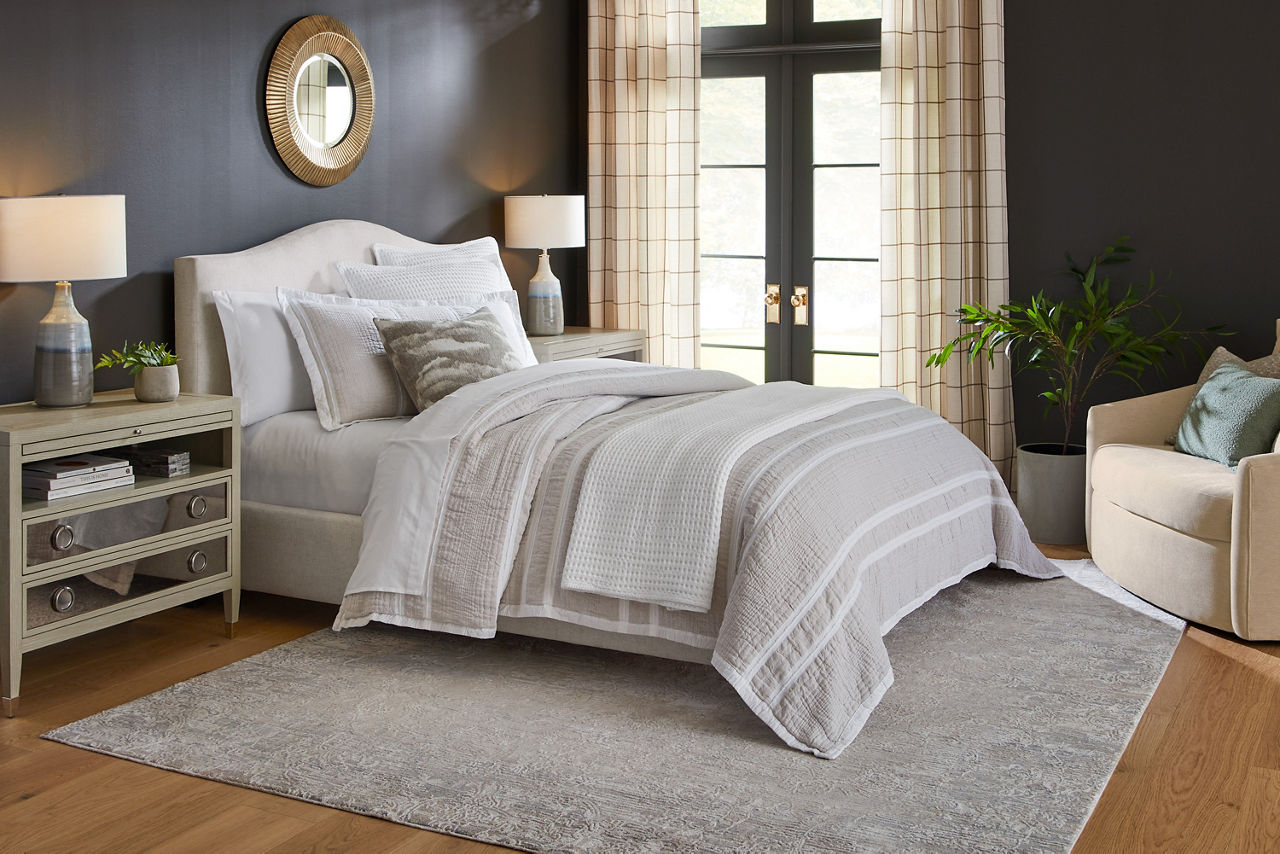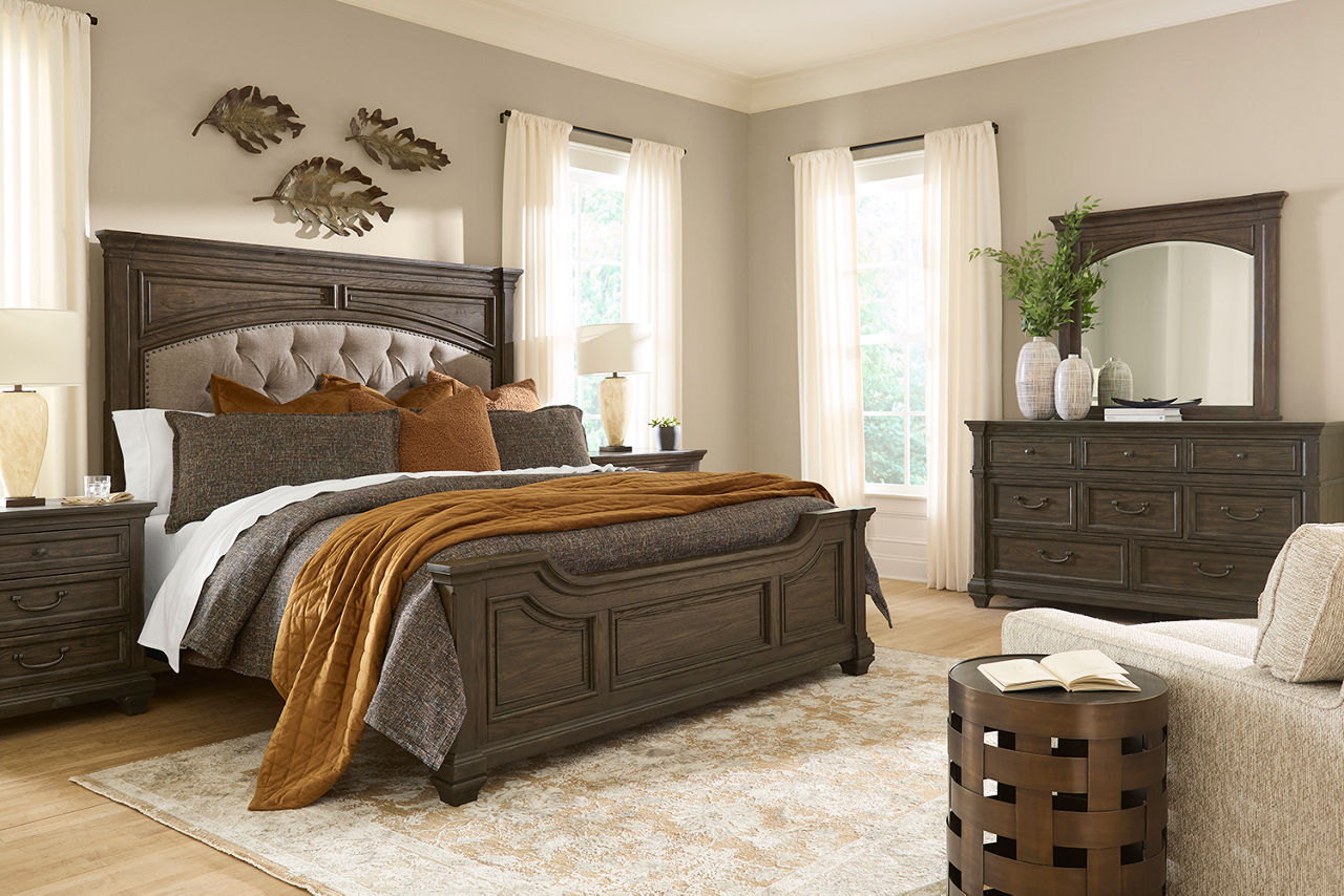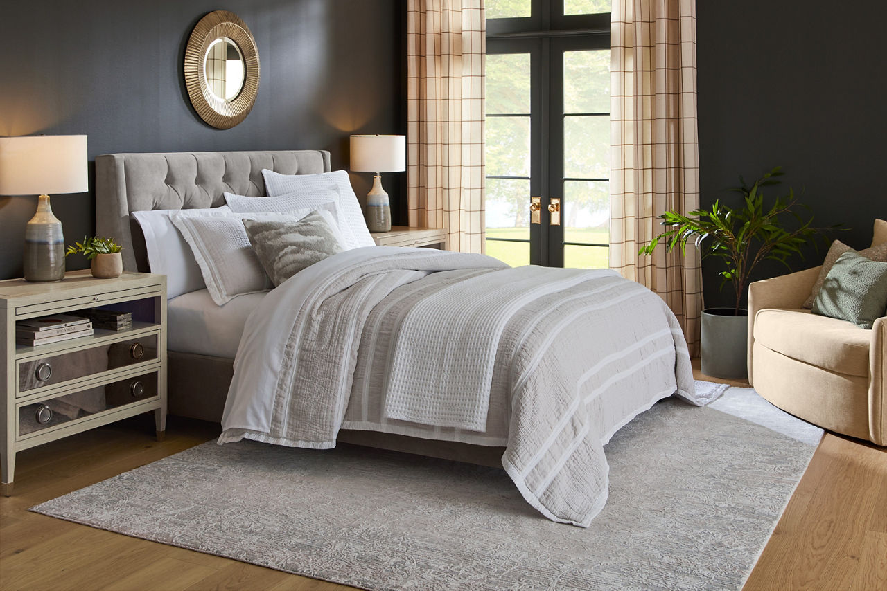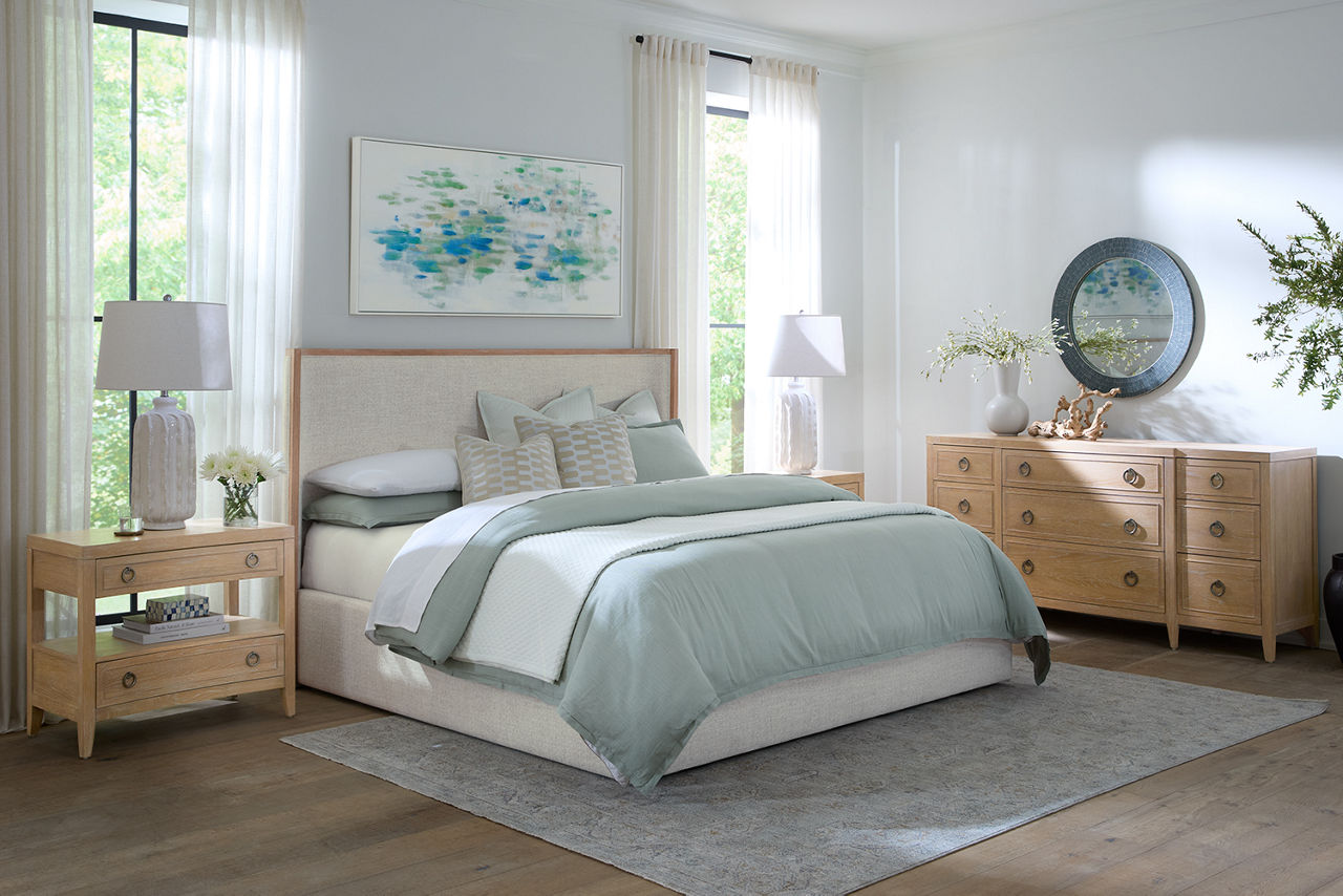Did you know the look of your bedroom helps with better sleep and relaxation? When you're in a space that's pleasing to the eye, you'll feel more comfortable and able to unwind. Havertys bedroom collections are made for style and comfort with several bedroom design ideas to choose from. Looking for a coastal bedroom furniture set? Our Coastal Retreat couldn't be more perfect. The crisp white louvered accents fit any coastal interior design style. Matching turned-wood knobs and bun feet elevate the charm factor. The collection includes a regular or storage bed, dresser with mirror, two-drawer and open nightstands, and door chest. Can't get enough of rustic style? We have your perfect rustic bedroom furniture with our Sherman collection. The natural look of acacia solid wood and veneers with clever distressing will give you that rugged charm you want to cozy up in. This collection includes a panel bed, dresser with mirror, 3-drawer and open nightstand, chest and media chest. We know farmhouse style is a timeless design that's here to stay. That's why we offer the inviting Briar Lake collection with a choice of shiplap or barndoor bed frames. Antique white finishes are complemented by black metal hardware in this collection that includes adult and kids’ beds, adult and kids’ dresser with mirror 2-drawer nightstand and open nightstand, chest and door chest. Experience the formal elegance of our Bernhard collection with burnished bark finish, ornate lattice design and vintage hardware. You'll feel likeroyalty every time you drift into dreamland with this bedroom furniture set that includes a bed, dresser with mirror, 3-drawer nightstand, chest and master chest. Once you've selected your dream bedroom set, be sure to read how to care for the material in our Furniture Care Guide. You can start your search for your personalized bedroom collection by using our online room planning tool and 3D Room Planner. Our sales consultants and Havertys Design Experts can help you select the best bed, nightstand, dresser and accent chair to go with your bedroom set. Update a few pieces, mix and match or purchase a complete bedroom furniture collection ready for our expert delivery. Our Top Drawer Delivery service will uncrate, inspect and protect your pieces before they enter the delivery truck and assemble your items in your home.