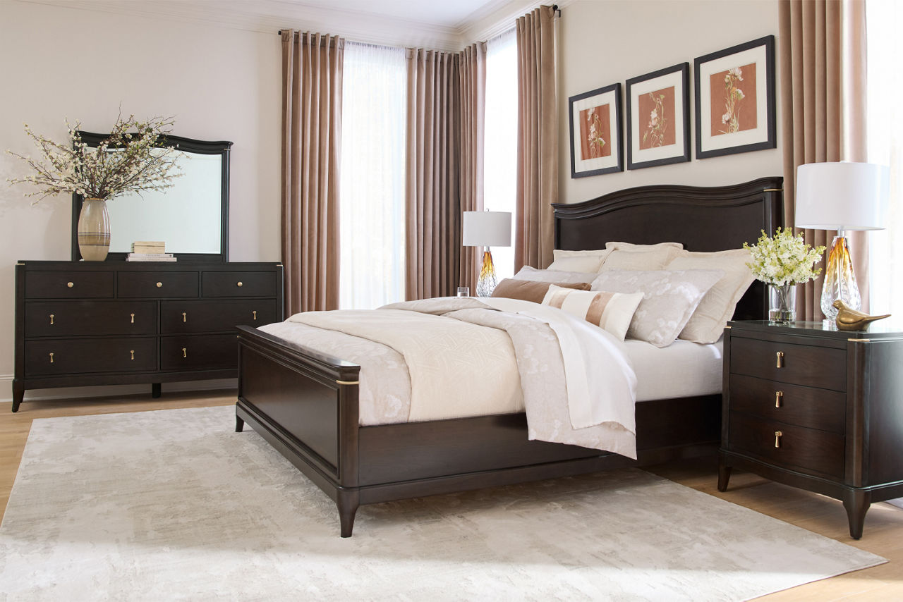 Did you know the look of your bedroom helps with better sleep and relaxation? When you're in a space that's pleasing to the eye, you'll feel more comfortable and able to unwind. Havertys bedroom collections are made for style and comfort with several bedroom design ideas to choose from. Looking for a coastal bedroom furniture set? Our Nantucket collection couldn't be more perfect. The crisp white louvered accents fit any coastal interior design style. Matching turned-wood knobs and bun feet elevate the charm factor. The collection includes a poster bed, storage bed, dresser with mirror, drawer and open nightstands and drawer chest. Can't get enough of rustic style? We have your perfect rustic bedroom furniture with our Sherman collection. The natural look of acacia solid wood and veneers with clever distressing will give you that rugged charm you want to cozy up in. This collection includes a panel bed, dresser with mirror, 3-drawer and open nightstand, chest and media chest. We know farmhouse style is a timeless design that's here to stay. That's why we offer the inviting Briar Lake collection with a choice of shiplap or barndoor bed frames. Antique white finishes are complemented by black metal hardware in this collection that includes adult and kids’ beds, adult and kids’ dresser with mirror 2-drawer nightstand and open nightstand, chest and door chest. Experience the formal elegance of our Bernhard collection with burnished bark finish, ornate lattice design and vintage hardware. You'll feel likeroyalty every time you drift into dreamland with this bedroom furniture set that includes a bed, dresser with mirror, 3-drawer nightstand, chest and master chest. Once you've selected your dream bedroom set, be sure to read how to care for the material in our Furniture Care Guide. You can start your search for your personalized bedroom collection by using our online room planning tool and 3D Room Planner. Our sales consultants and Havertys Design Experts can help you select the best bed, nightstand, dresser and accent chair to go with your bedroom set. Update a few pieces, mix and match or purchase a complete bedroom furniture collection ready for our expert delivery. Our Top Drawer Delivery service will uncrate, inspect and protect your pieces before they enter the delivery truck and assemble your items in your home.