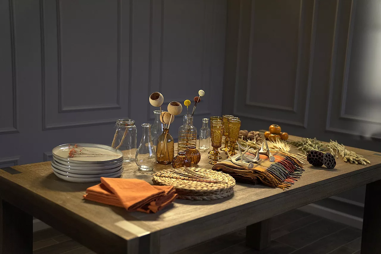 Place amber glasses at each place setting. Then use several antlers to create movement across the table and around the bottles.