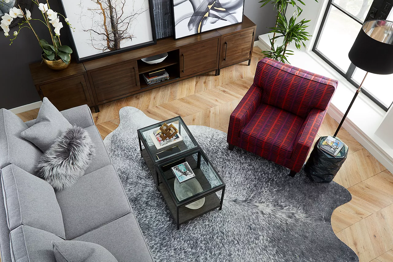 Instead of getting carried away by the room’s now adventurous spirit, Emily’s H Design Consultant turned her attention to sleek, functional pieces that wouldn’t distract from her more glamorous design choices. Thankfully she had a lot to choose from with a variety of accent tables that range from gorgeous statement pieces to functional designs with convenient drawers and shelving. Her first choice, our Keaton coffee tables, offers the beauty of glass tops and the practicality of bunching and moving with ease for versatility and growth in a small space.
