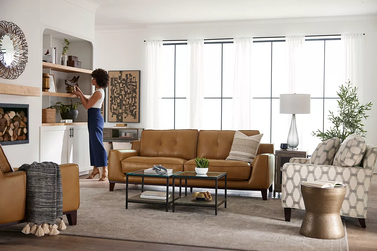 Austin-native Emily knew that she wanted to create a sophisticated and modern living room that was inspired by her childhood roots. However, making all of those design decisions by herself proved to be overwhelming. So, she contacted her local Havertys and was paired with a talented Havertys Design Expert. Together they worked to create a design that expressed Emily’s fashionable and unique personality. With a beautiful blend of top-grain leather, metal accents and an earth-toned color palette, Emily now has the stylishly comfortable entertainment space that she has always wanted.Shop this look