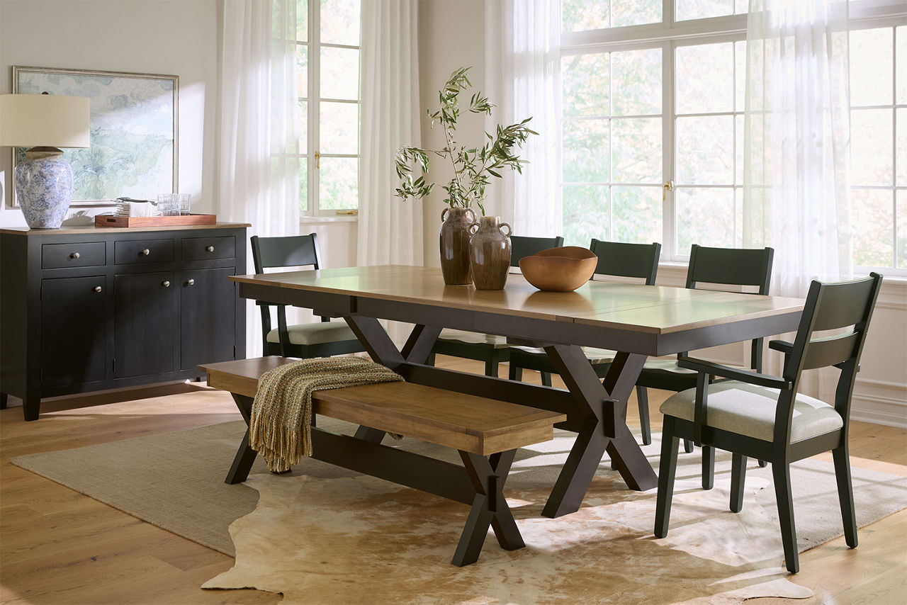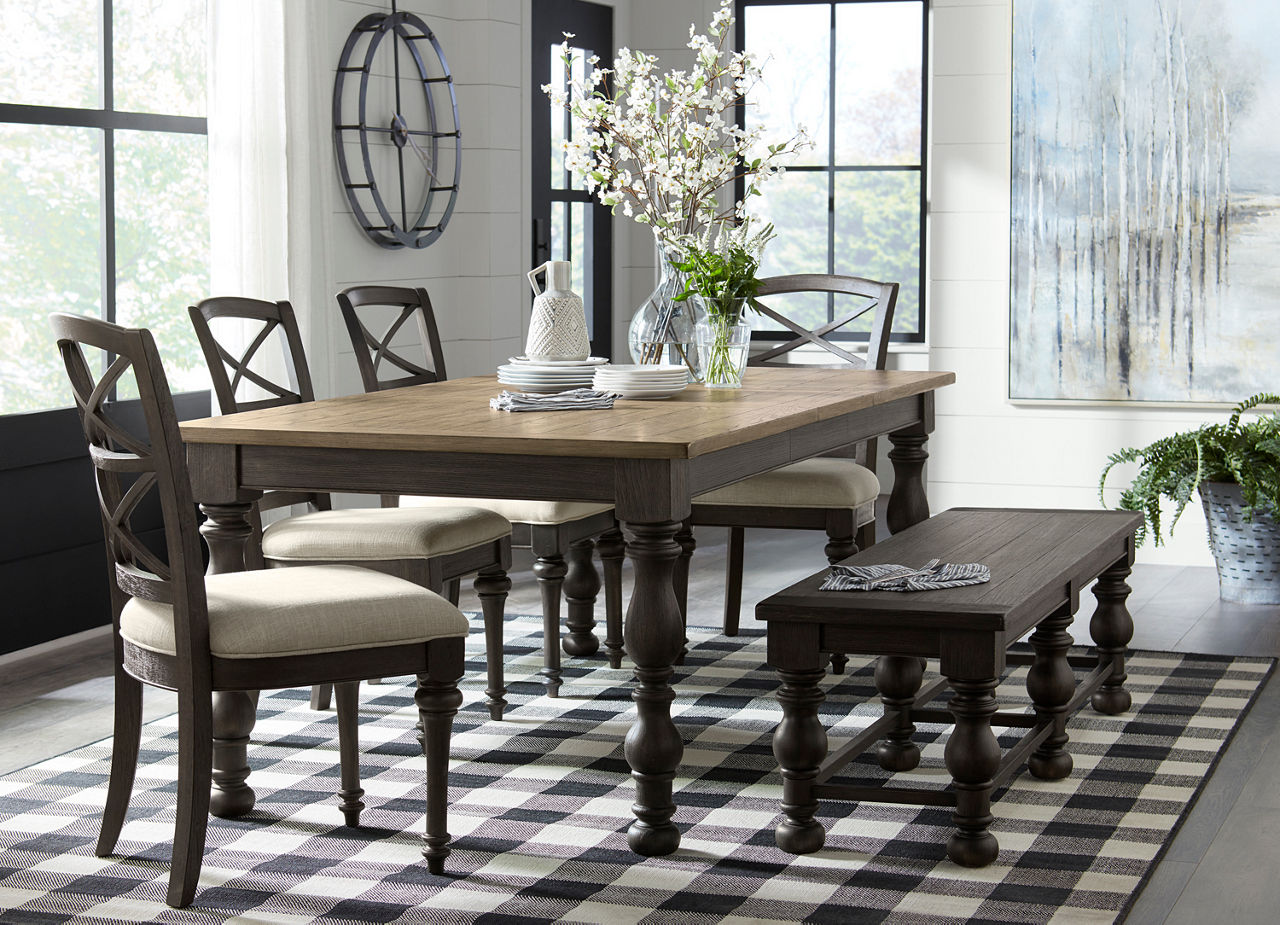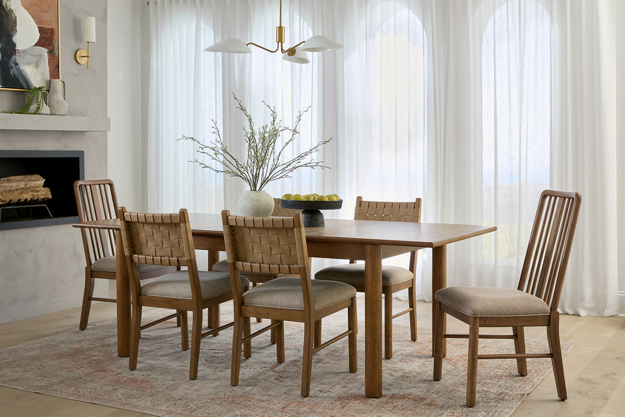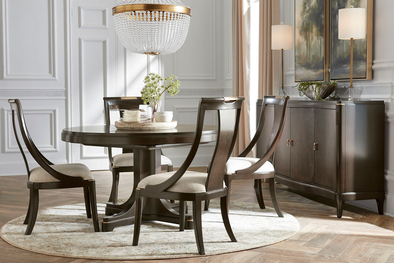 Your dining room is where memories happen. From family gatherings to dinner parties with friends, make your space look stylish and polished with Havertys dining room collections. Our coordinated dining room sets can fit any design style and accommodate any size room, from large dining room furniture to small dining room sets. If you love the look of mid-century modern dining room furniture but want a slightly upscale version, our Avalon and Olsen collections are for you. With tapered legs, armless shell chair and bench seating, this dining room collection is modern with just a hint of retro and lots of sophistication. These collections include dining tables, upholstered chairs and counter chairs, bench and server. When your dining room requires an elegant touch, the white oak dining room furniture of our Candler collection fits the bill. Each piece is hand-crafted with a burnished grey finish and light upholstery for grand sophistication. This collection includes a rectangular dining room table with a double pedestal base, upholstered chairs and arm chairs, buffets, curio cabinet and matching mirror. Rustic and industrial design lovers will find our River City Foundry collection checks all the boxes. The hearty dark wood and forged iron framework is slightly distressed with cow-tailing, wormholes and nicks for a rough-around the edges look that is beautiful to behold. This collection includes a rectangular dining table, round dining table, counter-height table, stool, tube stool, bench, buffet, console and shelf unit. While this collection does not include dining chairs, we recommend upholstered Parsons chairs to add a touch of softness. Once you've selected your dream dining room set, be sure to read how to care for the material in our Furniture Care Guide. You can start your search for your personalized dining room collection by using our online room planning tool and 3D Room Planner. Our sales consultants and Havertys Design Experts can help you select the best dining table, dining chairs, buffet or server to go with your dining room set. Update a few pieces, mix and match or purchase a complete dining room furniture collection ready for our expert delivery. Our Top Drawer Delivery service will uncrate, inspect and protect your pieces before they enter the delivery truck and assemble your items in your home.