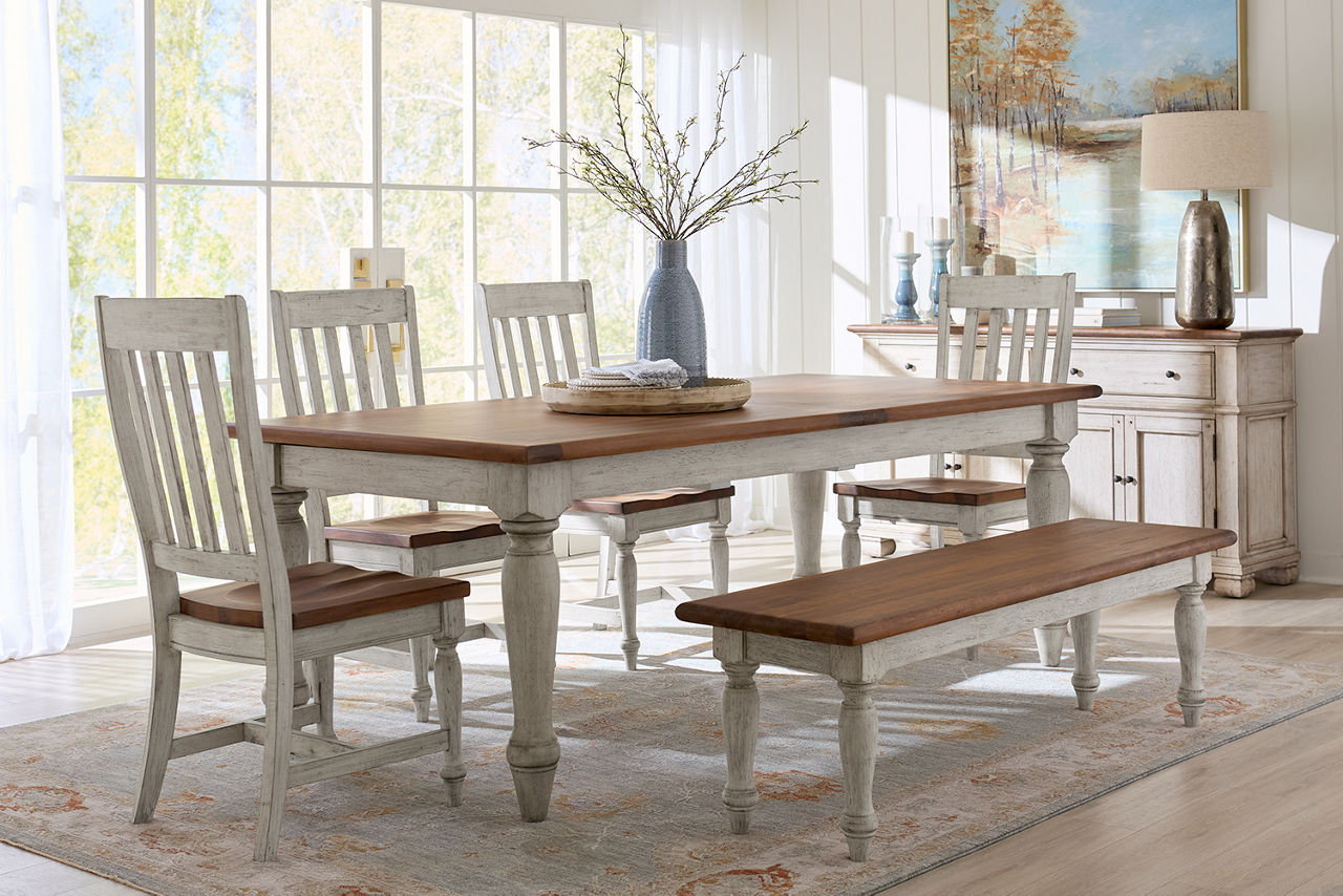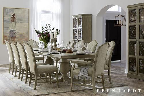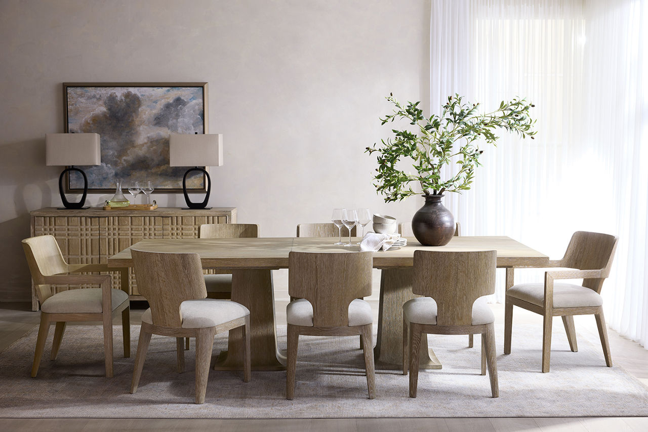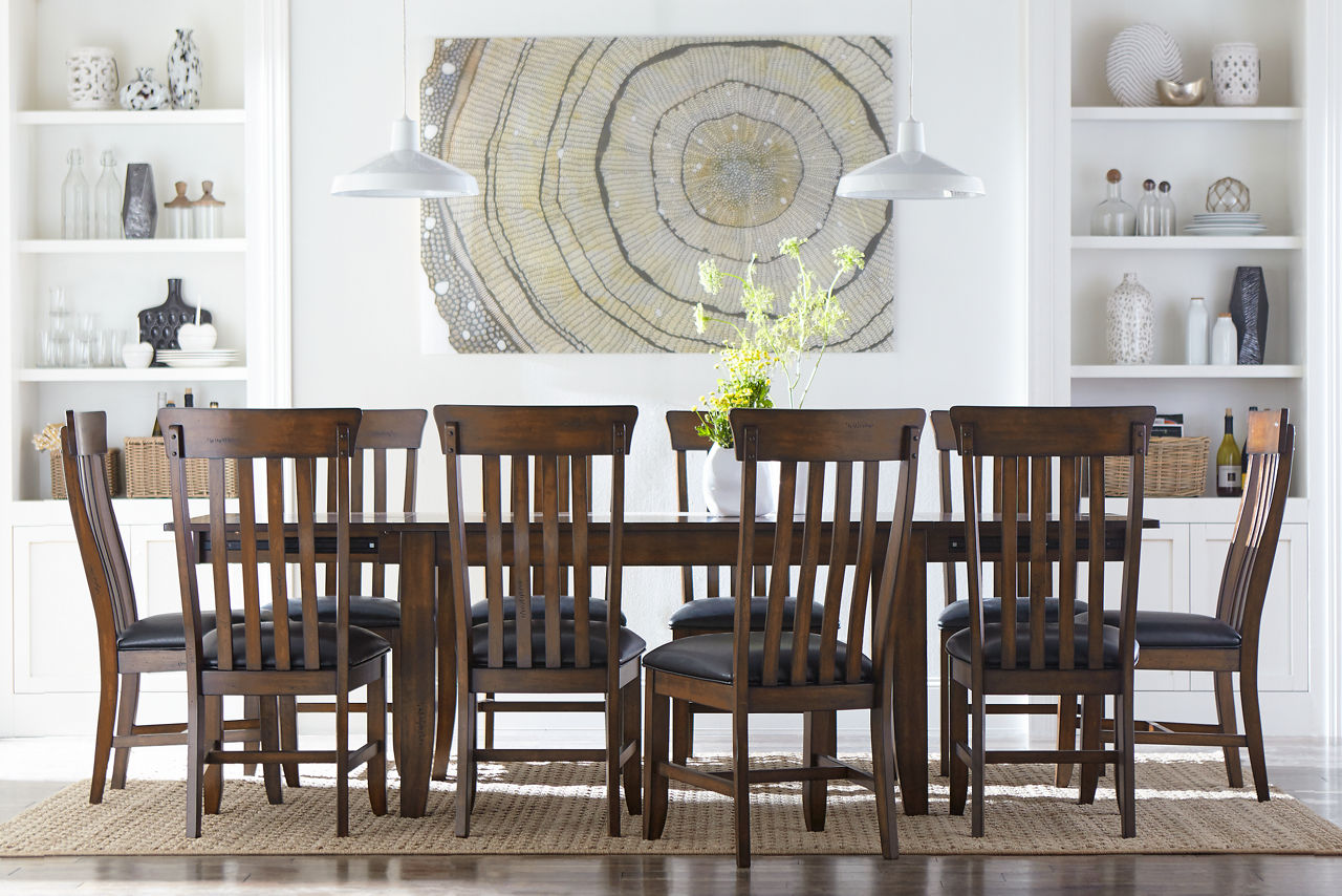 Your dining room is where memories happen. From family gatherings to dinner parties with friends, make your space look stylish and polished with Havertys dining room collections. Our coordinated dining room sets can fit any design style and accommodate any size room, from large dining room furniture to small dining room sets. If you love the look of mid-century modern dining room furniture but want a slightly upscale version, our Avalon and Olsen collections are for you. With tapered legs, armless shell chair and bench seating, this dining room collection is modern with just a hint of retro and lots of sophistication. These collections include dining tables, upholstered chairs and counter chairs, bench and server. When your dining room requires an elegant touch, the white oak dining room furniture of our Candler collection fits the bill. Each piece is hand-crafted with a burnished grey finish and light upholstery for grand sophistication. This collection includes a rectangular dining room table with a double pedestal base, upholstered chairs and arm chairs, buffets, curio cabinet and matching mirror. Rustic and industrial design lovers will find our River City Foundry collection checks all the boxes. The hearty dark wood and forged iron framework is slightly distressed with cow-tailing, wormholes and nicks for a rough-around the edges look that is beautiful to behold. This collection includes a rectangular dining table, round dining table, counter-height table, stool, tube stool, bench, buffet, console and shelf unit. While this collection does not include dining chairs, we recommend upholstered Parsons chairs to add a touch of softness. Once you've selected your dream dining room set, be sure to read how to care for the material in our Furniture Care Guide. You can start your search for your personalized dining room collection by using our online room planning tool and 3D Room Planner. Our sales consultants and Havertys Design Experts can help you select the best dining table, dining chairs, buffet or server to go with your dining room set. Update a few pieces, mix and match or purchase a complete dining room furniture collection ready for our expert delivery. Our Top Drawer Delivery service will uncrate, inspect and protect your pieces before they enter the delivery truck and assemble your items in your home.