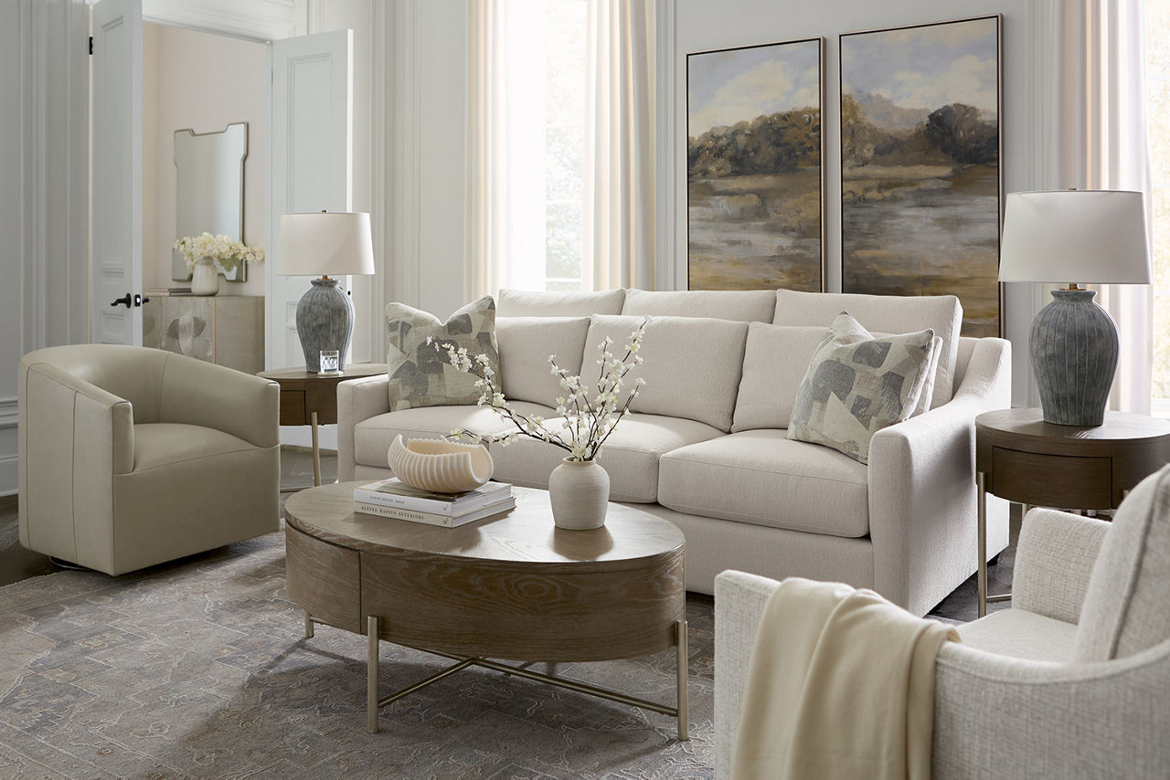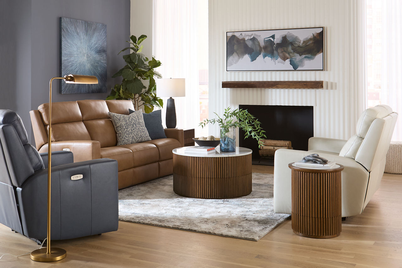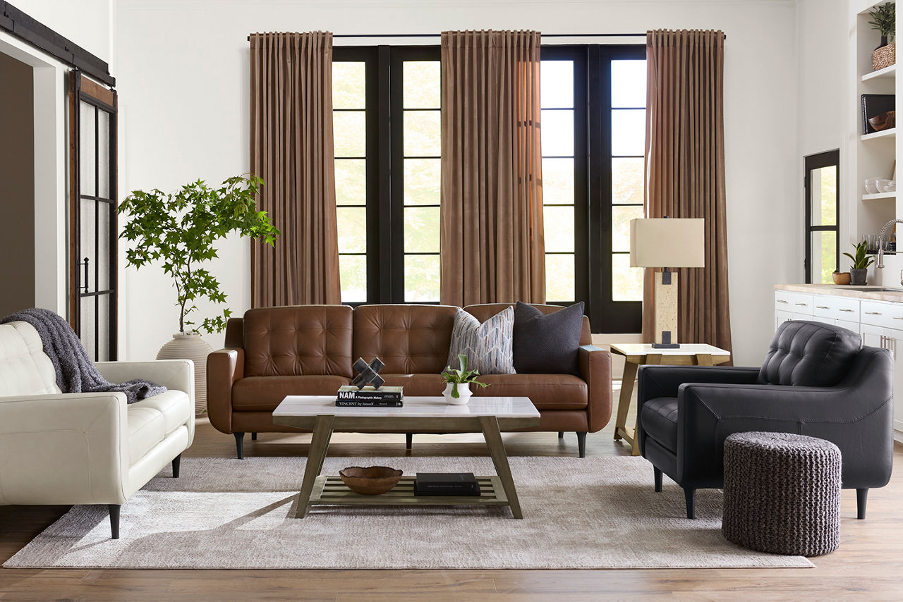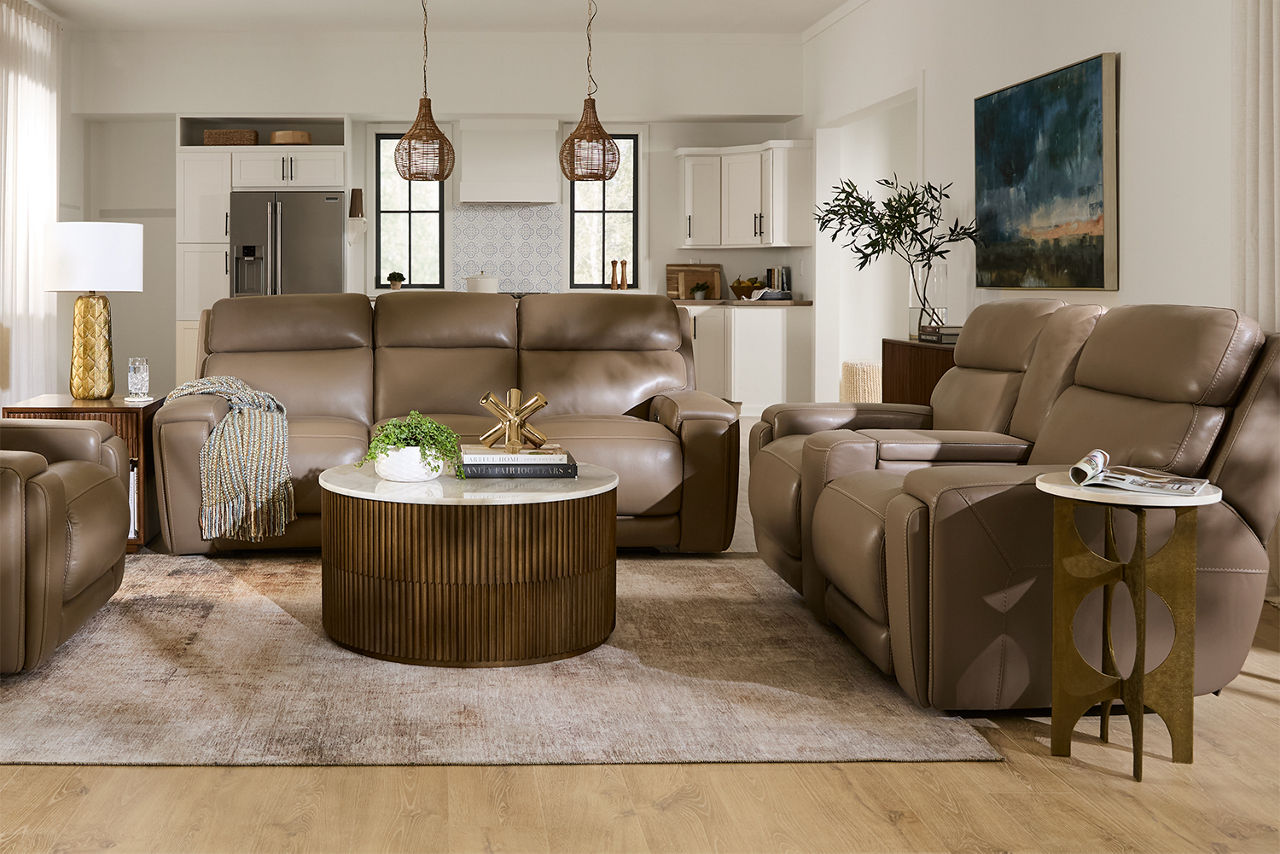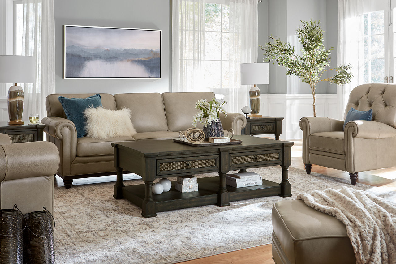 Havertys living room collections come in a large variety of styles and options to include something for every family member. You can configure our modular living room furniture for small living room arrangements or large living room layouts. Imagine having living room furniture with something every family member can agree on by creating a custom look for a u-shaped living room or l-shaped living room, with a chaise lounge or sectional recliners. Suppose you're longing for leather living room furniture. In that case, we have several living room collections to choose from our elegant Regis collection with AC and USB ports for charging electronics to the Drake living room set with nailhead trim and rolled arms. For mid-century modern living room ideas, we offer the Metropolis collection with a tufted sofa. The Gibson living room collection comes in a variety of colors, each with luxe, top-grain leather upholstery to provide a modern, rugged look. Maybe you want to be good to the planet with eco-friendly living room furniture. Our Norfolk and Laney living room collections have you covered. With timeless silhouettes and revolutionary eco-friendly foam fills in the 1.8 density cushion. Each collection comes with various options such as sectionals, sofas, loveseats, swivel chairs, recliners, chaise chairs and ottomans to mix and match for a custom look for any size room, from grand living rooms to small living room ideas. Once you've selected your dream living room set, be sure to read how to care for the material in our Furniture Care Guide. You can start your search for your personalized living room collection by using our online room planning tool and 3D Room Planner. Our sales consultants and Havertys Design Experts can help you select the best sofa, loveseat, chaise lounge or accent chair to go with your living room set. Update a few pieces, mix and match or purchase a complete living room furniture collection ready for our expert delivery. Our Top Drawer Delivery service will uncrate, inspect and protect your pieces before they enter the delivery truck and assemble your items in your home.