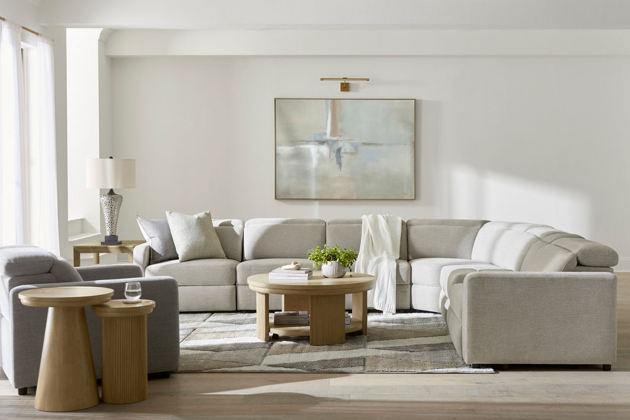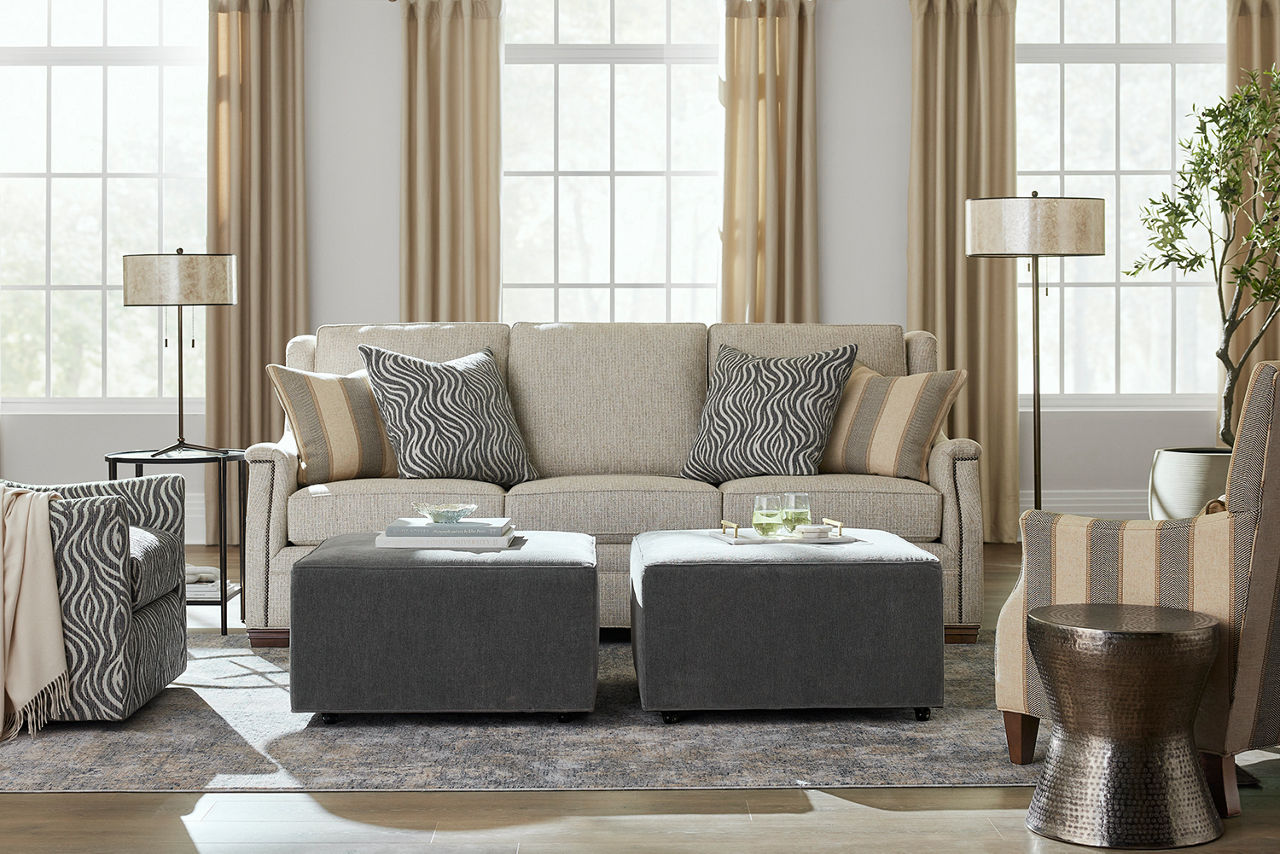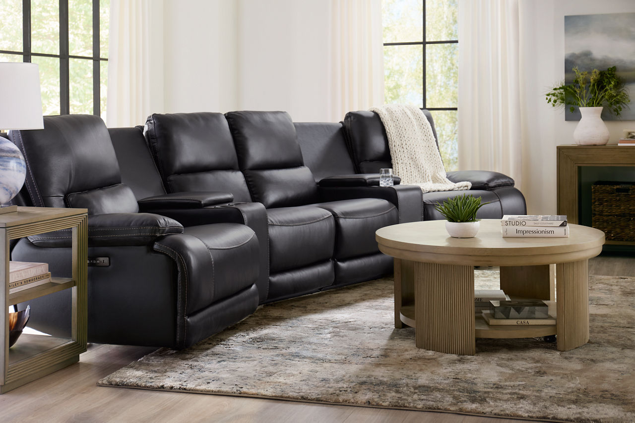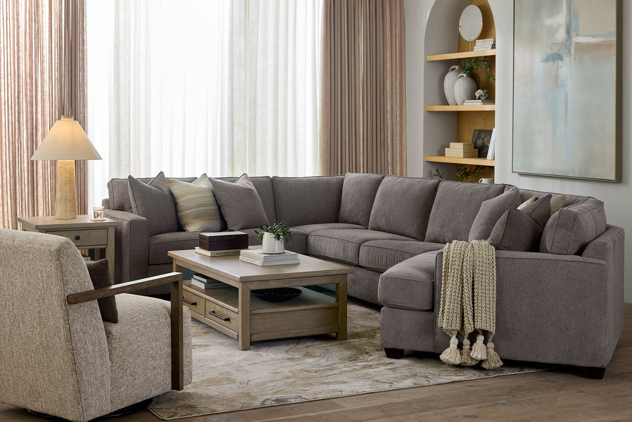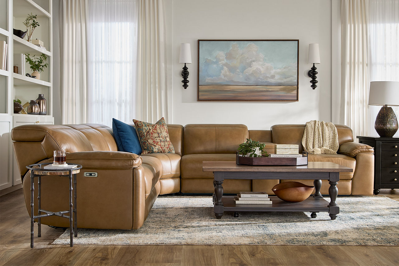 Havertys living room collections come in a large variety of styles and options to include something for every family member. You can configure our modular living room furniture for small living room arrangements or large living room layouts. Imagine having living room furniture with something every family member can agree on by creating a custom look for a u-shaped living room or l-shaped living room, with a chaise lounge or sectional recliners. Suppose you're longing for leather living room furniture. In that case, we have several living room collections to choose from our elegant Regis collection with AC and USB ports for charging electronics to the Drake living room set with nailhead trim and rolled arms. For mid-century modern living room ideas, we offer the Metropolis collection with a tufted sofa. The Gibson living room collection comes in a variety of colors, each with luxe, top-grain leather upholstery to provide a modern, rugged look. Maybe you want to be good to the planet with eco-friendly living room furniture. Our Norfolk and Laney living room collections have you covered. With timeless silhouettes and revolutionary eco-friendly foam fills in the 1.8 density cushion. Each collection comes with various options such as sectionals, sofas, loveseats, swivel chairs, recliners, chaise chairs and ottomans to mix and match for a custom look for any size room, from grand living rooms to small living room ideas. Once you've selected your dream living room set, be sure to read how to care for the material in our Furniture Care Guide. You can start your search for your personalized living room collection by using our online room planning tool and 3D Room Planner. Our sales consultants and Havertys Design Experts can help you select the best sofa, loveseat, chaise lounge or accent chair to go with your living room set. Update a few pieces, mix and match or purchase a complete living room furniture collection ready for our expert delivery. Our Top Drawer Delivery service will uncrate, inspect and protect your pieces before they enter the delivery truck and assemble your items in your home.
