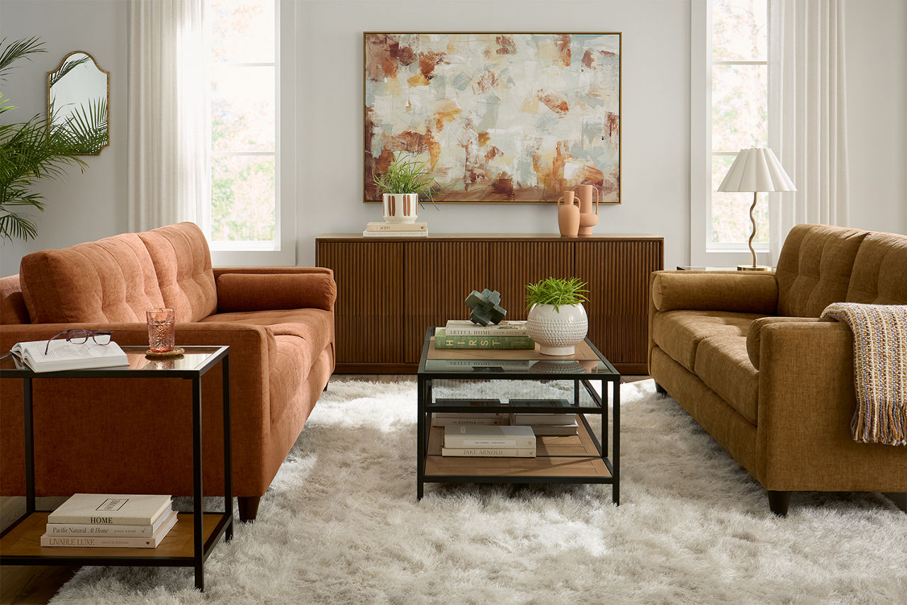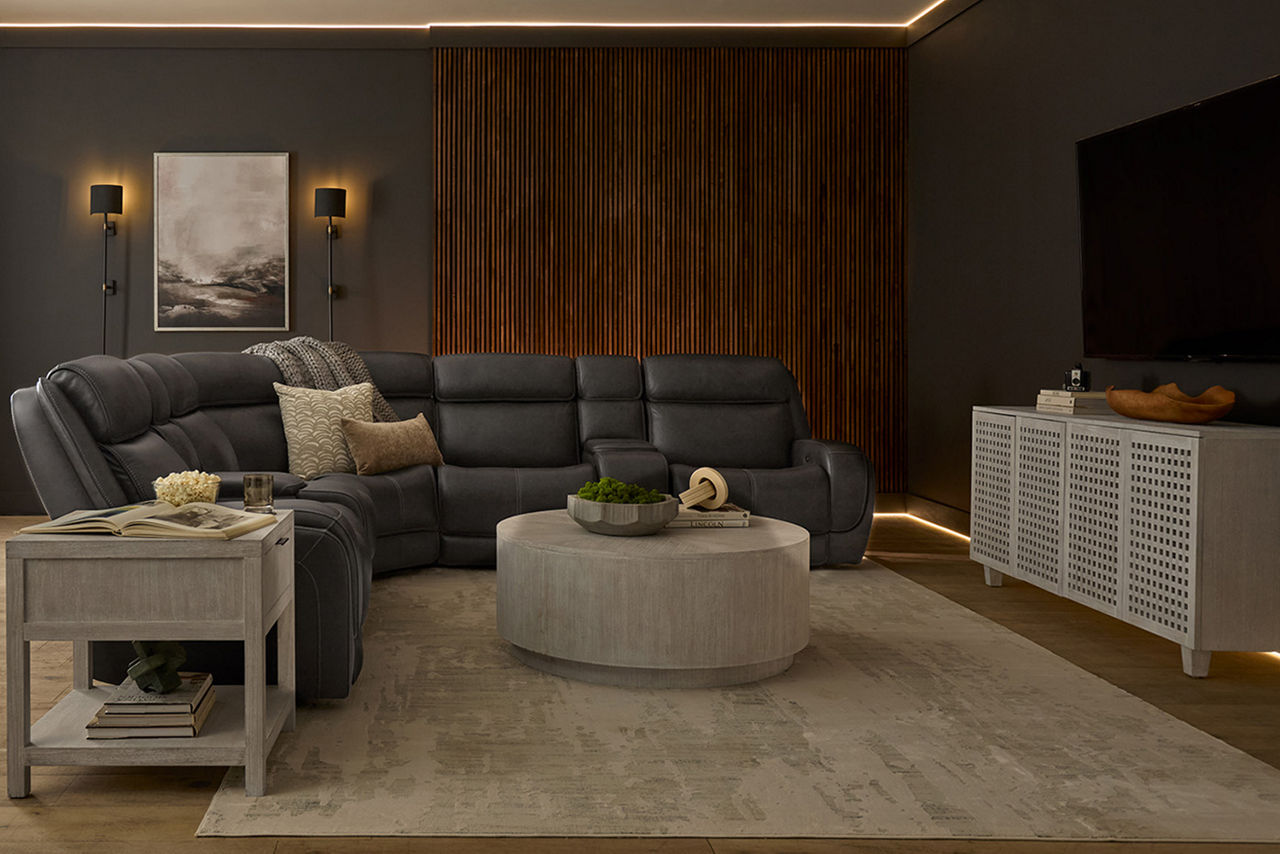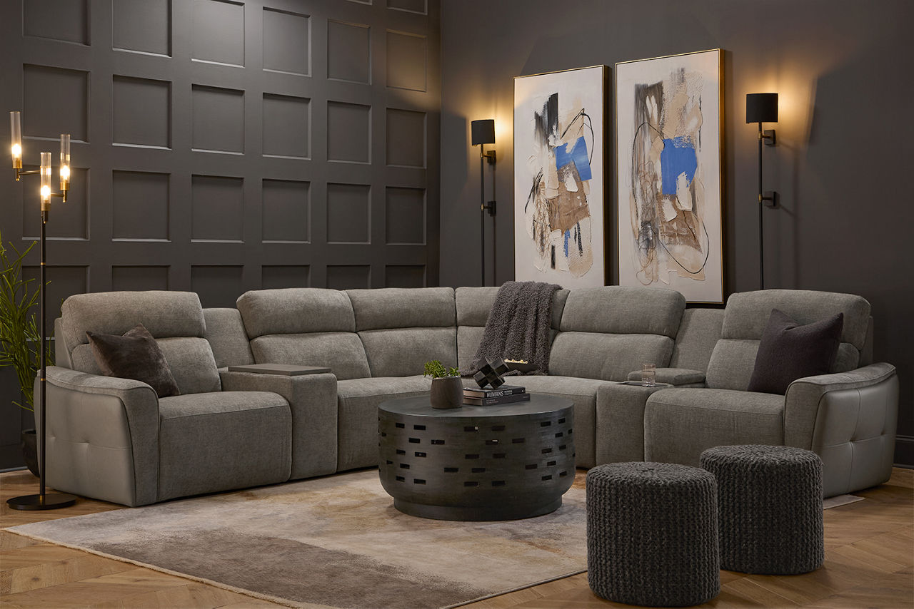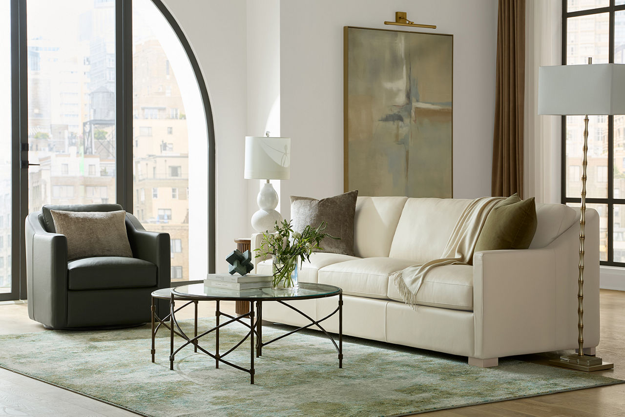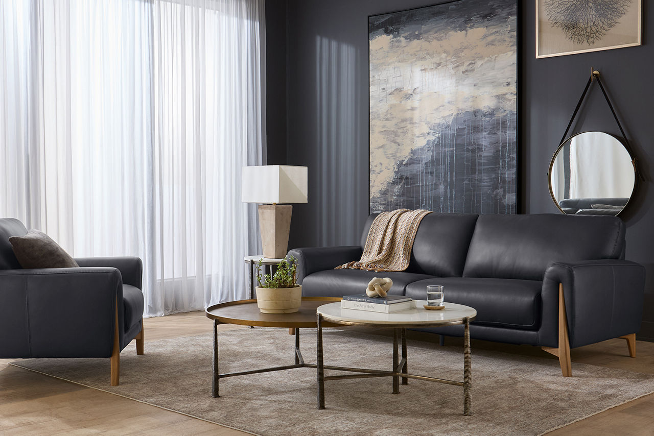 Havertys living room collections come in a large variety of styles and options to include something for every family member. You can configure our modular living room furniture for small living room arrangements or large living room layouts. Imagine having living room furniture with something every family member can agree on by creating a custom look for a u-shaped living room or l-shaped living room, with a chaise lounge or sectional recliners. Suppose you're longing for leather living room furniture. In that case, we have several living room collections to choose from our elegant Regis collection with AC and USB ports for charging electronics to the Drake living room set with nailhead trim and rolled arms. For mid-century modern living room ideas, we offer the Metropolis collection with a tufted sofa. The Gibson living room collection comes in a variety of colors, each with luxe, top-grain leather upholstery to provide a modern, rugged look. Maybe you want to be good to the planet with eco-friendly living room furniture. Our Norfolk and Laney living room collections have you covered. With timeless silhouettes and revolutionary eco-friendly foam fills in the 1.8 density cushion. Each collection comes with various options such as sectionals, sofas, loveseats, swivel chairs, recliners, chaise chairs and ottomans to mix and match for a custom look for any size room, from grand living rooms to small living room ideas. Once you've selected your dream living room set, be sure to read how to care for the material in our Furniture Care Guide. You can start your search for your personalized living room collection by using our online room planning tool and 3D Room Planner. Our sales consultants and Havertys Design Experts can help you select the best sofa, loveseat, chaise lounge or accent chair to go with your living room set. Update a few pieces, mix and match or purchase a complete living room furniture collection ready for our expert delivery. Our Top Drawer Delivery service will uncrate, inspect and protect your pieces before they enter the delivery truck and assemble your items in your home.